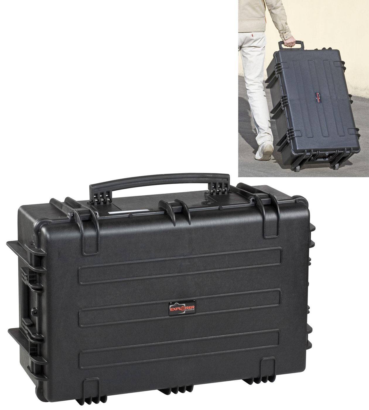 Большие кейсы сертифицированные по IP67. Два человека поднимают боковые ручки и выдвижную ручку. Самосмазывающиеся свободно вращающиеся колеса.